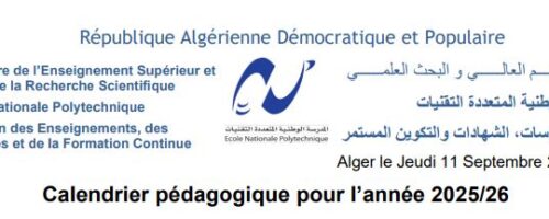 Calendrier pédagogique pour l’année 2025/2026 18/11/2025 Prolongation de la période de paiement électronique des droits d’inscription et de réinscription 2025-2026. 11/11/2025 Emploi du temps du Centre de langues 19/10/2025 Réinscription des doctorants réguliers 2025-2026 19/10/2025 Évènements 14 Sept À l’attention de tous les nouveaux étudiants admis 22 Sept À l’attention des nouveaux bacheliers inscrits à l’ENP 08 Fév Le 16ᵉ Salon International des Inventions au Moyen-Orient 2026 Visite Virtuelle de l'Ecole Nationale Polytechnique Toutes les actualités International Conference on Mechanical and Electrical Engineering for Green Energy Technologies Voir ici Conference on Fractional Differentiation and its Applications Voir ici Appels D'Offre Voir ici L'ENP en chiffres Carte Étudiants Animée Etudiants 1400+ Carte Valise Sans Fond Enseignants 179 Carte Diplômés Diplômés 11776+ Carte Spécialités Spécialités 13+ Carte Laboratoires Laboratoiresde recherche 12