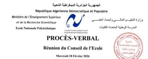 PV- Réunion du Conseil de l’École 25/02/2026 Appel à participants AGU 2026 09/03/2026 Call for participants: GU 2026 Spring 11/01/2026| Évènements18/02/2026 Évènements 14 Fév Soutenance de thèse doctorat- TRAD Ameur 15 Fév Bourse Magister à Brunei Darussalam 2026-2027. 18 Fév Call for participants: GU 2026 Spring Visite Virtuelle de l'Ecole Nationale Polytechnique Toutes les actualités International Conference on Mechanical and Electrical Engineering for Green Energy Technologies Voir ici Conference on Fractional Differentiation and its Applications Voir ici Appels D'Offre Voir ici L'ENP en chiffres Carte Étudiants Animée Etudiants 1400+ Carte Valise Sans Fond Enseignants 179 Carte Diplômés Diplômés 11776+ Carte Spécialités Spécialités 13+ Carte Laboratoires Laboratoiresde recherche 12