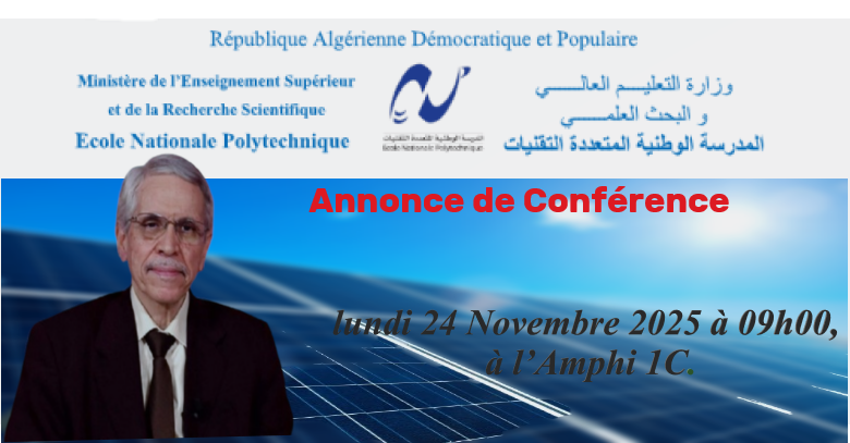 Annonce de conférence 19/11/2025| Évènements Les atouts de l’électricité verte et de l’hydrogène vert pour l’émergence de l’Algérie voir l’annonce Les plus récents Prolongation de la période de paiement électronique des droits d’inscription et de réinscription 2025-2026. 03/11/2025 À l’attention de tous les nouveaux étudiants admis 13/09/2025 À l’attention des nouveaux bacheliers inscrits à l’ENP 08/09/2025
